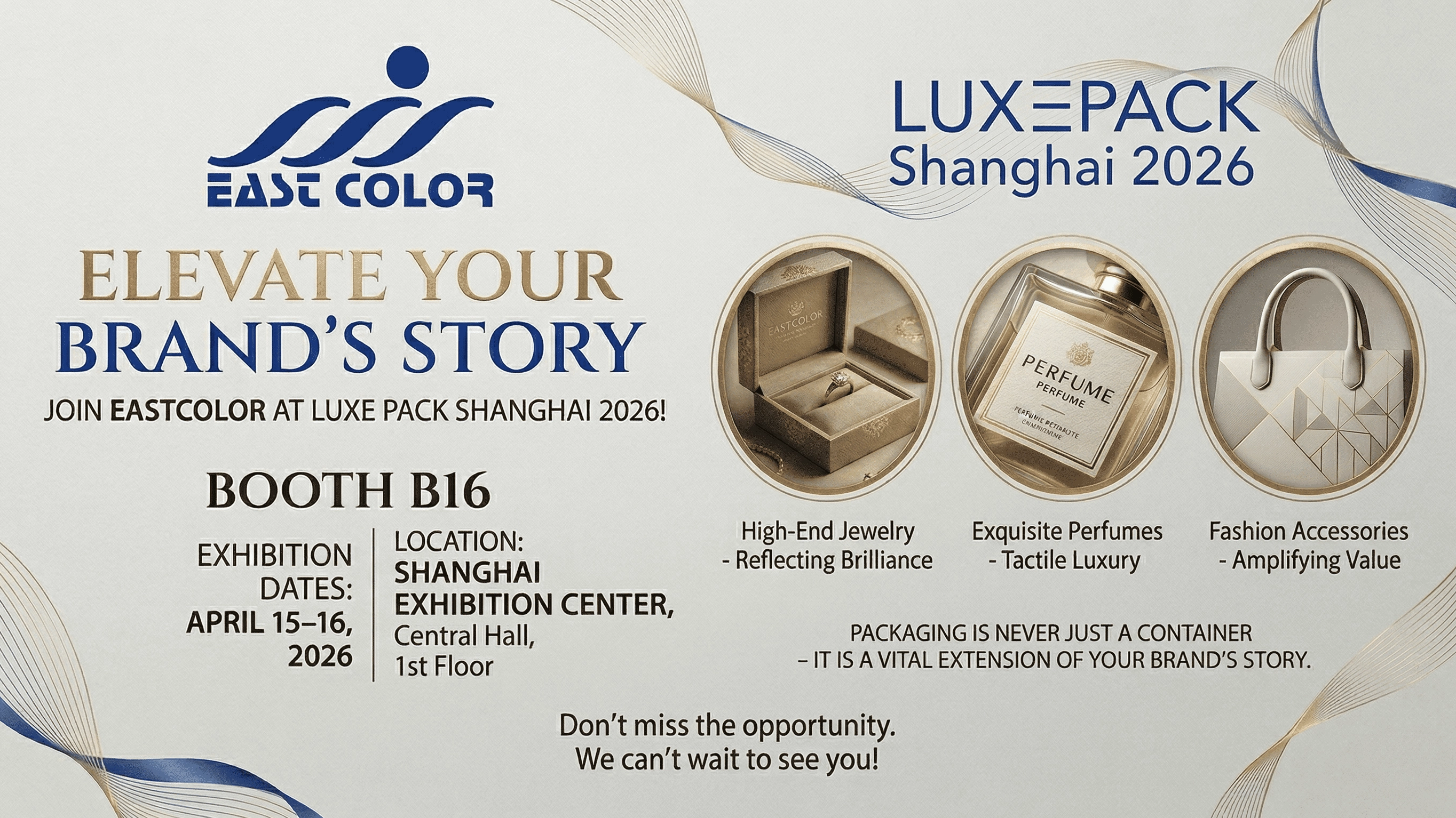 At EastColor, we believe that packaging is never just a container—it is a vital extension of your brand’s story and a touchpoint for emotional connection with your customers. From April 15th to 16th, 2026, we will be transforming Booth B16 at the Shanghai Exhibition Center into a showcase of innovation and elegance.